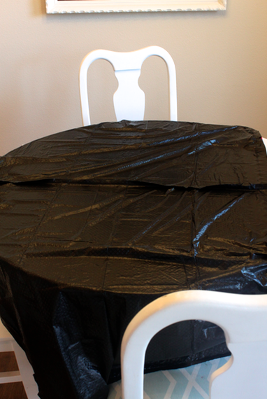 1. Cover your table in plastic (I used big black garbage bags). When you apply the paint onto the fabric, it will bleed through the back (unless you use a really thick fabric), so it’s a good idea to protect the table with plastic.